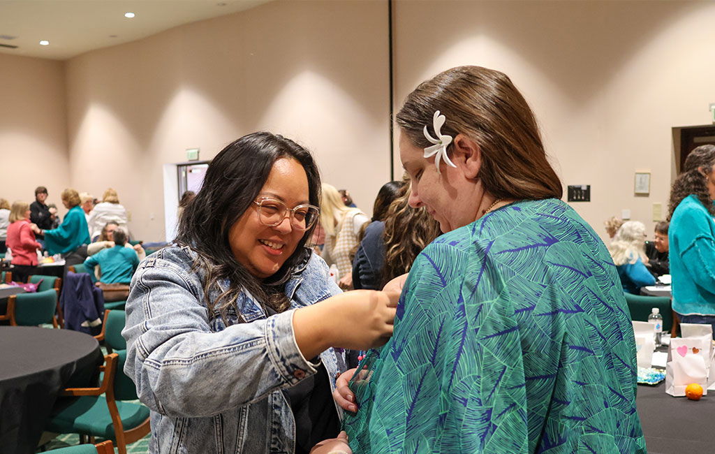 Ten Jocson, president of Hawaii WMU, places a WMU logo pin on Melanie Hom, declaring she is meant for the mission. Jocson and Hom traveled from Hawaii to Alabama to join approximately 210 WMU leaders from all over the country.